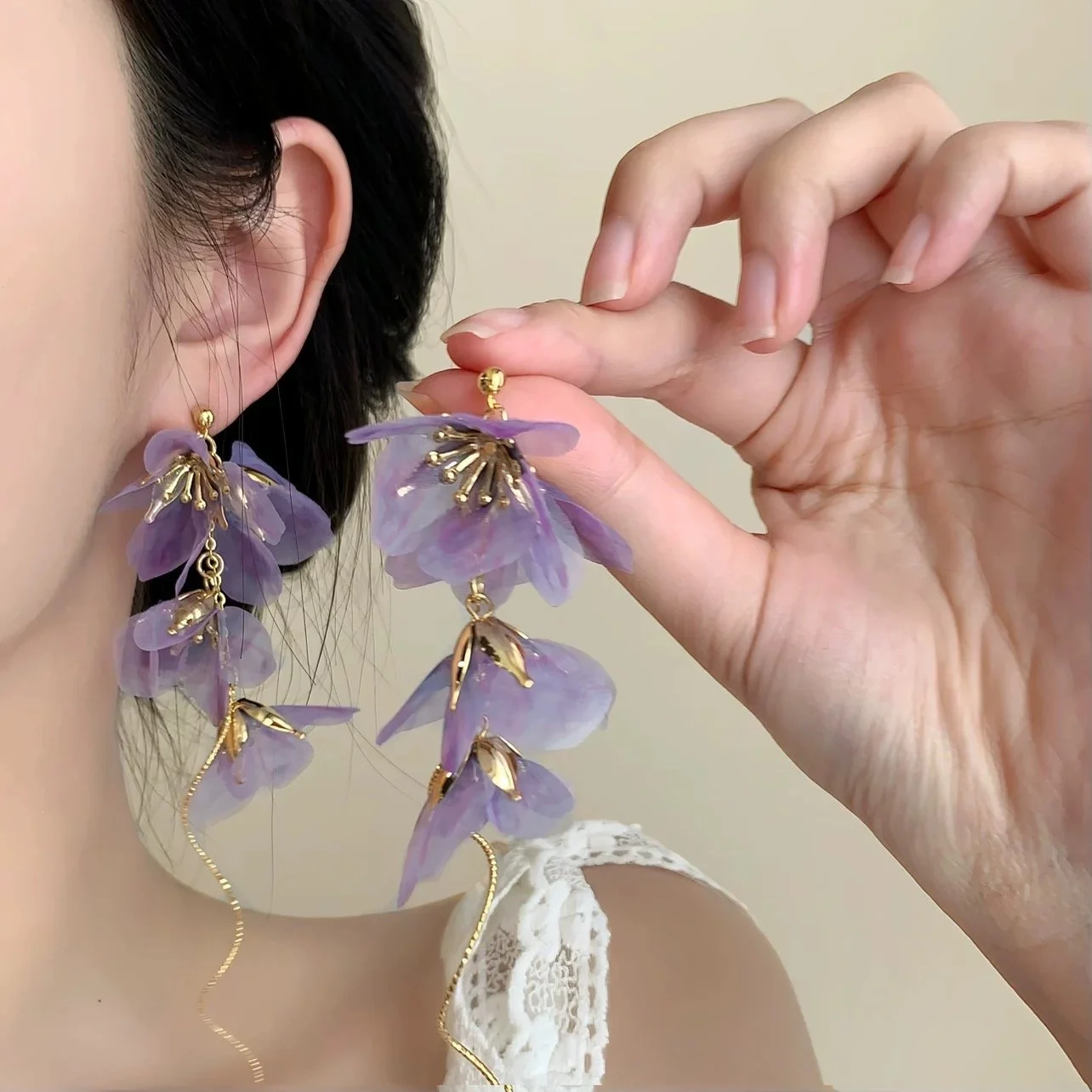 Delicate, wisteria-inspired drop earrings featuring cascades of pink petals accented with gold buds. Each earring falls in three soft tiers that sway with movement, finishing in a slender, serpentine gold chain that adds length and sparkle.
